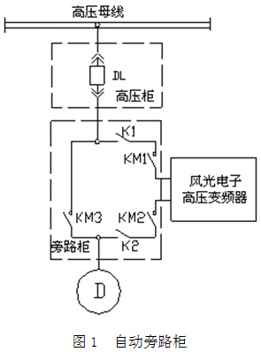 圖1旁路柜在變頻器進(jìn)、出線端增加了兩個(gè)隔離刀閘,以便在變頻器退出后而電機(jī)運(yùn)行于旁路時(shí),能安全地進(jìn)行變頻器的故障處理或維護(hù)工作。