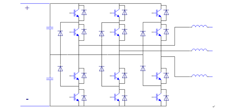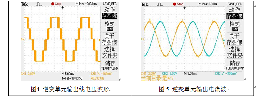 逆變裝置的單元采用三電平拓?fù)潆娐?,如圖3所示。逆變輸出電壓波形、輸出電流波形分別如圖4、5所示。
